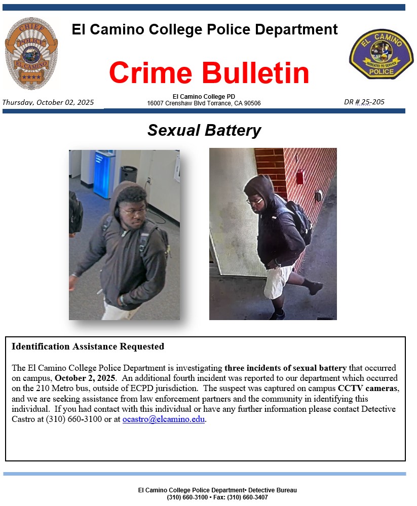 The following information contains crime alert bulletins for El Camino College and is provided in accordance with the Jeanne Clery Campus Safety Act (Clery Act).